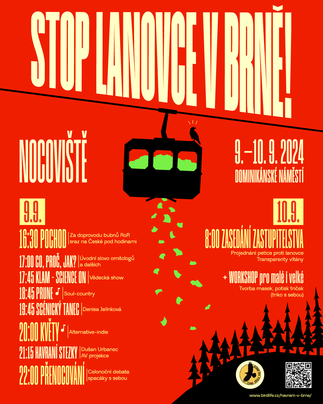 Přijďte vyjádřit svůj nesouhlas a podpořte svojí účastí ochranu cenné přírodní lokality v Brně, která je mimo jiné největším zimním nocovištěm havranů a kavek na jižní Moravě. Na akci je plánován bohatý kulturní program, včetně koncertů, workshopu a promítání „Havraních stezek“.